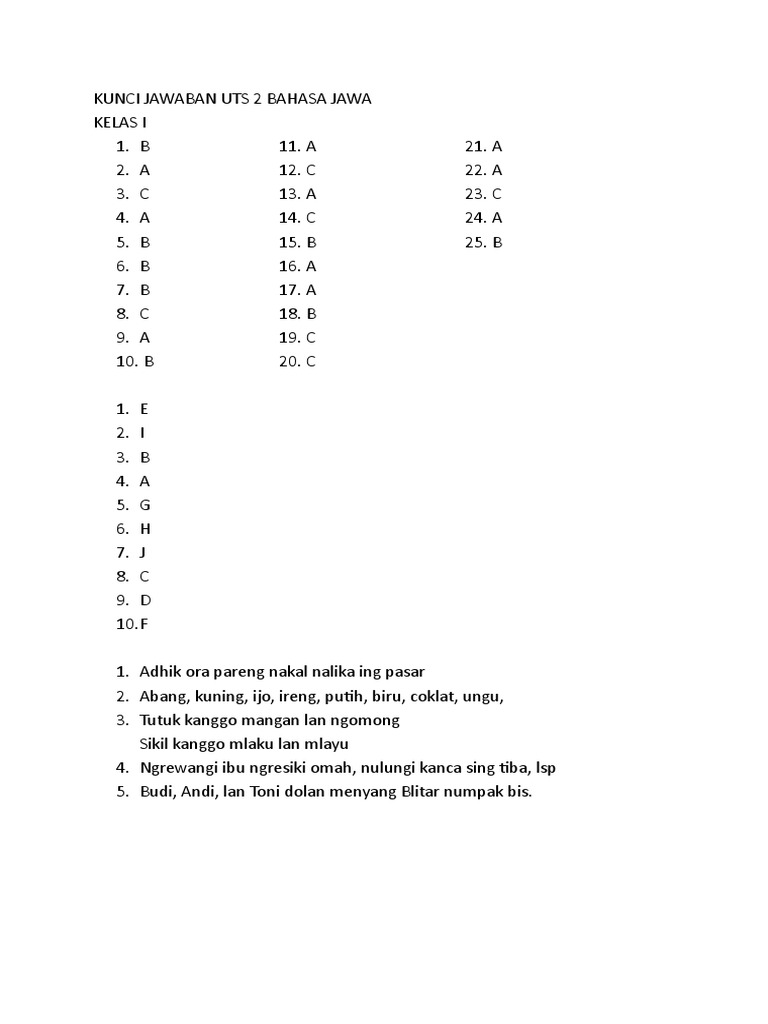 Kunci jawaban lks bahasa jawa kelas 5 semester 2 guru ilmu sosial kunci jawaban bahasa halaman 130 dan 131 kelas 7 soal dan kunci jawaban revisi bahasa jawa kelas 7. Soal bahasa jawa kelas 10 semester 2 dan kunci jawaban. Plisss kak dibantu ya soal bahasa jawa mulai gladhen 3 yg no 1. Jenis pengembangan teks eksposisi yang rinciannya tergolong dalam suatu objek ke dalam bagian bagian itu disebut jenis pengembangan. Download soal uts bahasa indonesia kelas 4 semester 2 berikut ini postingan terbaru soal uts bahasa indonesia kelas 4 semester 2 tahun ajaran 2017 2018 kunci jawaban room i 1 b 2 a 3 d 4 c 5 d 6 c 7 b 8 c 9 b 10 d 11 b 12 d 13 a 14 a 15 c 16 d 17 c 18 a 19 b 20 c.