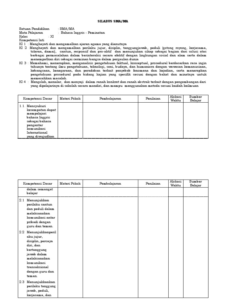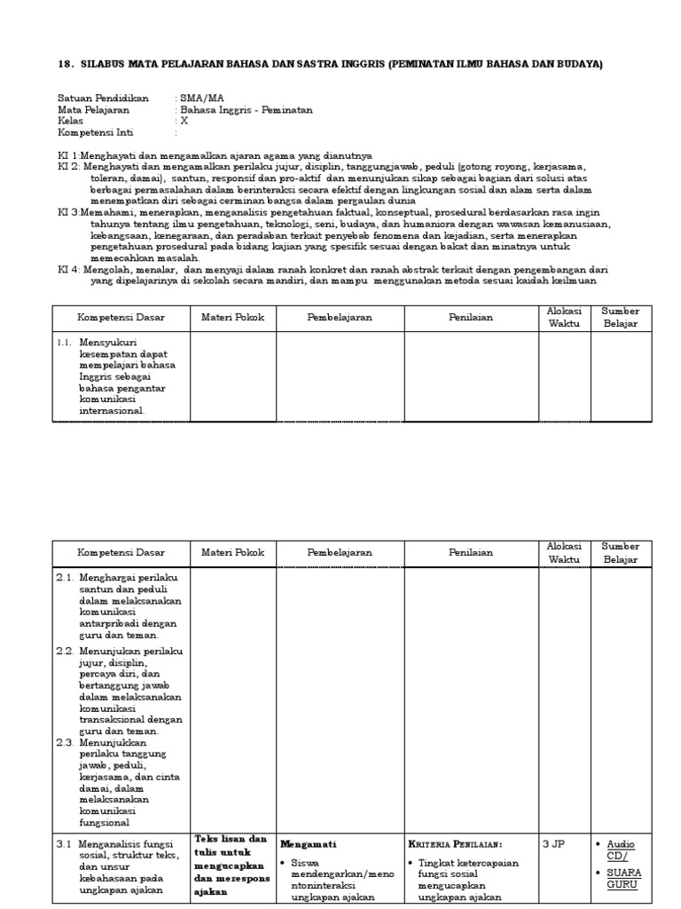 Menghayati dan mengamalkan ajaran agama yang dianutnya ki 2: Berbagi ke twitter berbagi ke facebook. Silabus sma/ma mata pelajaran : Menghayati dan mengamalkan ajaran agama yang dianutnya ki 2: Silabus ini merupakan versi terbaru pada sekolah menengah atas (sma), dalam format word sehingga memudahkan anda dalam mengedit dan menyesuaikan. Sekolah menengah atas/madrasah aliyah (sm a /ma). Silabus mata pelajaran bahasa dan sastra inggris (peminatan ilmu bahasa dan budaya) satuan pendidikan: Detail silabus peminatan bahasa inggris kelas xii pdf dapat kamu nikmati dengan cara klik link download dibawah dengan mudah tanpa iklan yang mengganggu. Standar kompetensi lulusan (skl) adalah kriteria untuk kemampuan lulusan yang memenuhi syarat, termasuk sikap, pengetahuan, dan keterampilan. Kali ini admin ingin share perangkat pembelajaran kurikulum 2013 revisi terbaru. Analisis skl, ki, kd bahasa inggris peminatan kelas x sma revisi 2017. Rencana pelaksanaan pembelajaran (rpp) 8. Mas wedan 9 december 2018 4.