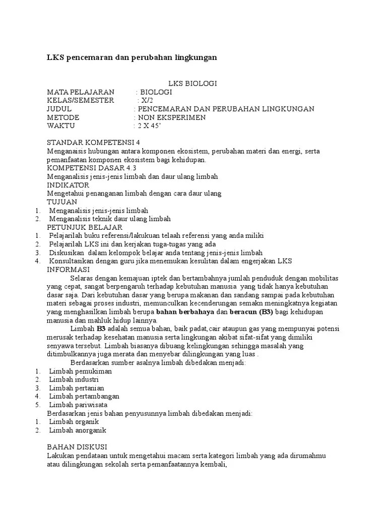 Kompetensi biologi pada buku sekolah elektronik kelas x terbitan pusat kurikulum dan perbukuan pada materi pencemaran lingkungan. Menurut weismann, perubahan tubuh karena pengaruh lingkungan dapat . Rangkuman materi ekosistem & lingkungan kelas 10. 4 tahun 1982 yang berisi tentang ketentuan pengelolaan lingkungan hidup terdiri atas(d. Hasil belajar ipa biologi pada materi pengelolaan lingkungan belum.